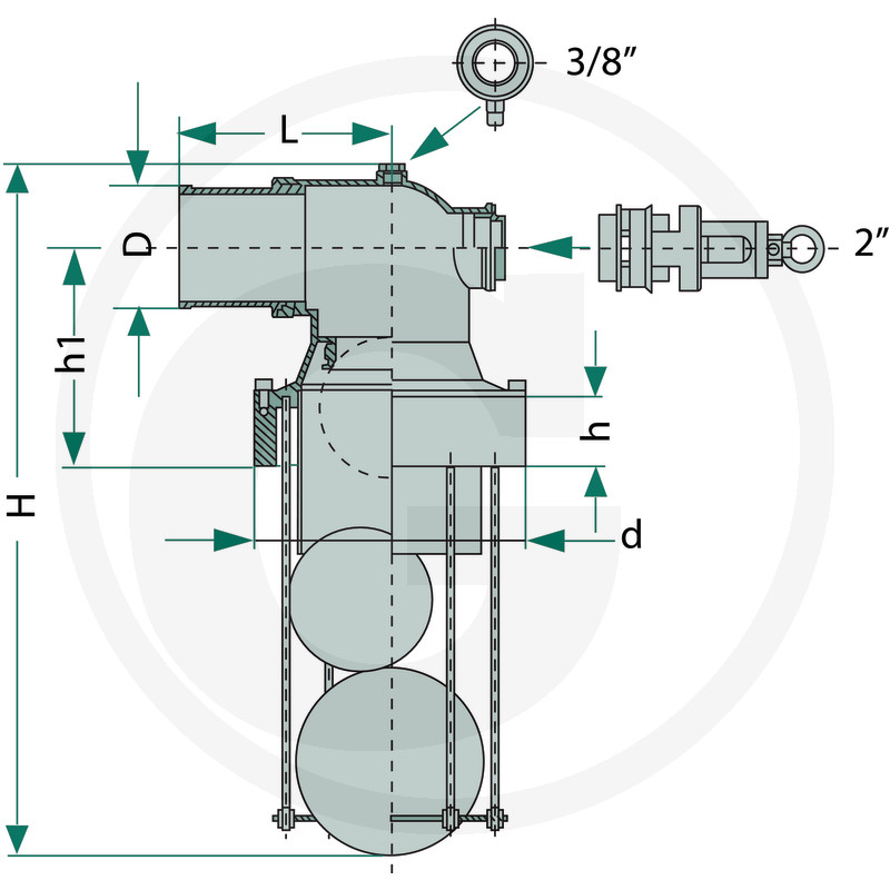 Diametru: 100 mm d: 229 mm I: 60 mm D: 102 mm h1: 185 mm L: 108 mm I: 586 mm Presiune de lucru: 4 bar Debit: 12000 1/min Cu 2 sfere Conexiune pentru manometru si supapa de siguranta Capacitate maxima de absorbtie: 8000 L/min Pentru *100: Capacitate maxima de absorbtie: 12000 L/min