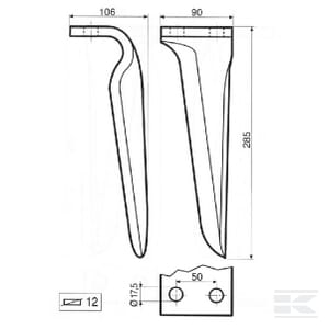KE0923 Dinte grapa rotativa stanga – compatibil Falc, L = 285 mm Dinte profesional pentru grapa rotativa, model KE0923, cu montaj pe partea stanga, compatibil cu utilaje agricole marca Falc. Fabricat din otel durabil, asigura performanta si rezistenta crescuta in conditii solicitante de lucru. Are o lungime de 285 mm, grosime de 12 mm si este prevazut cu 2 orificii de prindere cu diametru de 17,5 mm, aflate la o distanta de 50 mm intre ele, pentru montaj usor si fixare sigura.